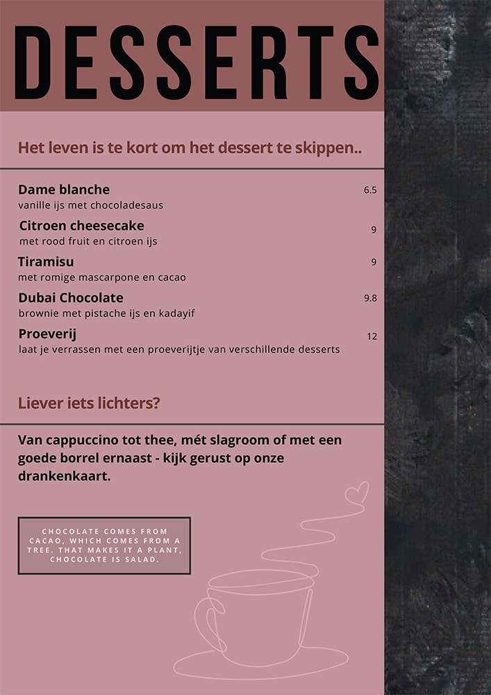 Op de maandag serveren we naast à la carte gerechten, tijdens het diner, ook een daghap! De daghap bestaat uit een hoofdgerecht, waarbij je kunt betalen wat je kunt missen of wat je voor de maaltijd over hebt. Geniet!